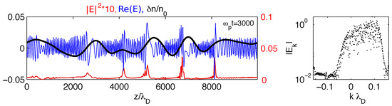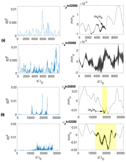 Below the threshold , three-wave decay processes can occur in plasmas with developed Langmuir turbulence; moreover they can be described within the frame of the weak turbulence theory for homogeneous plasmas [74]. In this case, the energy density carried by low-frequency as well as high-frequency waves is distributed quasi-uniformly in space and does not exhibit focused peaks isolated in some specific regions; wave decay is not a spatially localized process and can develop until its saturation stage.Figure 7a shows the corresponding space profiles of the Langmuir wave energy density and of the background plasma density fluctuations at two different times. One can see the appearance of short-wavelength density perturbations of significant amplitudes (i.e., ion acoustic oscillations) which can be separated from the long-wavelength fluctuations by an adequate filtering procedure [74]. At asymptotic times, the Langmuir wave turbulence and the ion acoustic oscillations are extended over all space (see Figure 7a at 35,000).