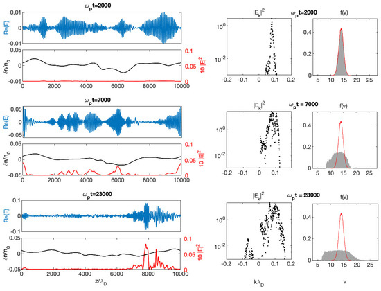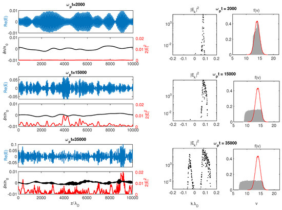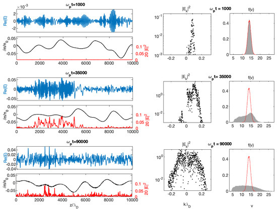 Beam dynamics’ and wave packet’s evolution at three moments of time, 15,000 and 35,000 (from upper to lower rows). (Left panels): Spatial profiles of the electric field envelope (blue) and of the energy density (red), superposed to the density fluctuations (black). (Middle panels): Corresponding electric field spectra in logarithmic scales. (Right panels): Corresponding electron velocity distributions (grey surfaces), superposed to the initial distribution (red curves). Main parameters are the following: . All variables are normalized. (Reproduced by permission of the AAS [10]).