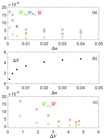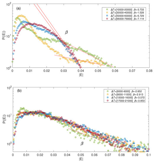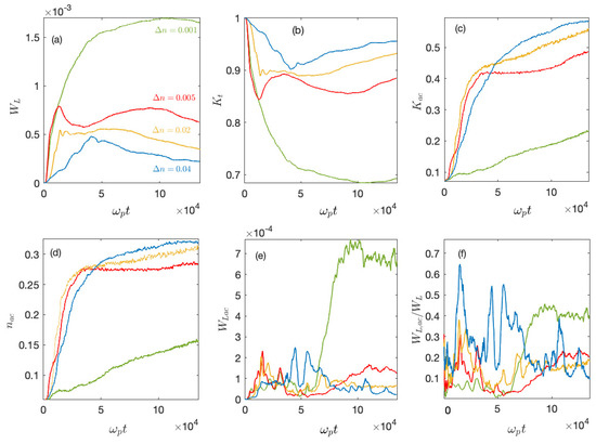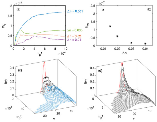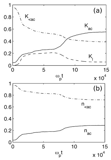 Let us define as the wave energy density carried by the Langmuir waves with phase velocities . For and at large times 50,000, and are growing and saturating (Figure 12e,f); these growths are only due to acceleration by damping of the decayed waves ; the saturation level of oscillates around . For , the two phenomena leading to particle acceleration occur both at 50,000, i.e., the transformation of waves on the density fluctuations and the second decay cascade process (which takes place only for 50,000). For , the larger , the larger the fraction of wave energy transferred during the waves’ transformation processes to waves with ; in the same conditions, the smaller , the larger the fraction transferred by the second decay cascade process to waves with .