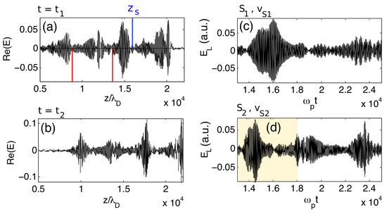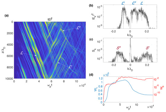 During the wave-wave interactions, the resonance conditions and are shown to be verified. According to the theory developed for homogeneous plasmas [58,123], those are satisfied if and , with and the Langmuir and ion acoustic wave dispersions are and The energy spectrum of the Langmuir waves as a function of time (Figure 8c) shows peaks around and and, at sufficient large times, a peak around ; indeed, second decay cascades start to occur, according to the channel producing Langmuir and acoustic waves and with and , i.e., with wavevectors of the same and the opposite signs as those of the mother waves , respectively. Finally, the growths with time of the high- and low-frequency energy densities and are presented in Figure 8d, showing that the ion acoustic waves start to grow at the stage when the Langmuir waves’ energy density has reached a steady state. The linear growth rate of the decay instability, calculated using Figure 8d, is shown to be smaller but rather close to the analytical predictions obtained for monochromatic waves in homogeneous plasmas [74,124].