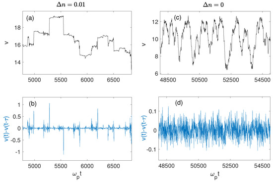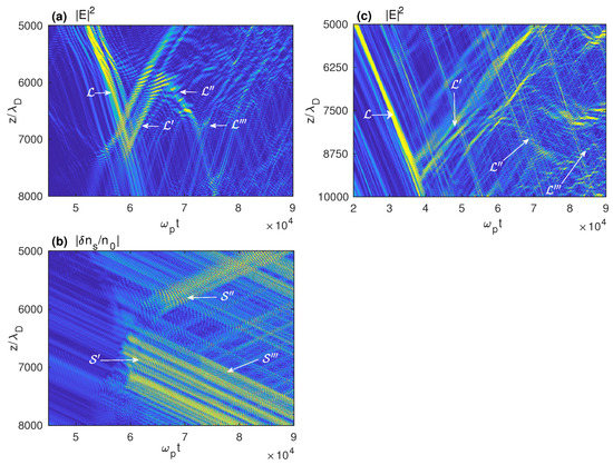 Decay processes can lead to several cascades of energy transfer to waves with longer wavelengths [11]. Figure 10a–c present the space-time variations of the wave energy density and the short-wavelength density perturbations when a third and last cascade occurs, a fourth cascade being not possible here due to the resonance conditions. One can observe the third decay cascade around 73,000 in the first example (Figure 10a,b), and near 80,000 in the second example including damping effects (Figure 10c). During the successive cascades and , the absolute values of the Langmuir wavenumbers , and become smaller at each decay, starting from the wavenumber of the beam-driven Langmuir waves; due to the resonance conditions, the Langmuir wave products satisfy and , whereas the ion acoustic daughter waves are characterized by the wavenumbers and .