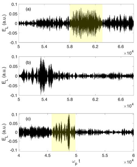 Langmuir waveforms (registered electric fields as a function of time) observed by a virtual satellite moving at the velocity and starting at time 50,000 when (a) it crosses a plasma region where wave decay occurs, (b) it crosses no region with decay. (c) Langmuir waveform observed by a virtual satellite moving with , starting at 40,000 and crossing a plasma region with wave decay. Main parameters are the following: (a,b) , (c) Regions showing specific modulations due to wave decay are colorized. All variables are normalized.