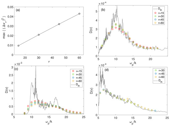 For a quasi-homogeneous plasma with Figure 15 shows the electron distribution at three different moments of the beam dynamics, i.e., at , at the time 47,500 when the transformation processes of the waves on the inhomogeneities are saturated (green), and at 170,000 when the second decay process occurs (blue); the distributions are superposed to their interpolations by Gaussians centered at . One observes that as is small, particles are weakly accelerated by the processes of waves’ transformations. However, another acceleration mechanism takes place due to the damping of the waves . One can see that at 170,000 and the tail of is denser than that of the Gaussian distribution. Indeed, the second decay cascade process is not totally saturated at this stage, as the spectrum of the Langmuir waves significantly varies within the velocity domain considered, as a result of local resonant energy exchanges between the tail electrons and the waves. In this case the accelerated electron tail deviates locally from the Gaussian behavior. However, when wave saturation is established, the tail distribution is Gaussian, due to the fact that in the velocity range above , the velocity diffusion coefficients of electrons are quasi-constant at saturation [68,77] (see also the next section). Note that the quasilinear theory predicts this kind of behavior in the velocity range where the waves’ energy exchanges with the particles are not significant. Moreover, when the two processes responsible for electron acceleration are fully saturated so that energy exchanges between particles and waves are very weak asymptotically, the coefficients can become quasi-constant at even when the plasma is inhomogeneous.