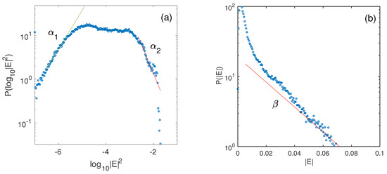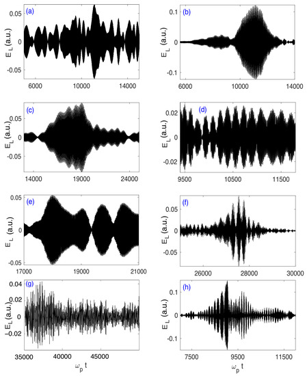 - Voshchepynets, A.; Volokitin, A.; Krasnoselskikh, V.; Krafft, C. Statistics of electric fields’ amplitudes in Langmuir turbulence: A numerical simulation study. J. Geophys. Res. (Space Phys.) 2017, 122, 3915–3934. [Google Scholar] [CrossRef]