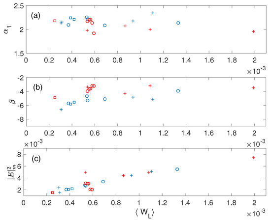 Moreover, Figure 5b shows that for , the rate of growth of the wave packet’s energy density decreases when increases, with a scaling law . In this case, the saturation levels of , which depend weakly on are significantly smaller than the saturation level reached in the case of homogeneous plasmas (i.e., for , see the upper curve of Figure 5a), in accordance with the reduction of wave radiation by the beam due to the density fluctuations. Please note that we also will quantify in a next section the influence of on the kinetic energy density carried by the accelerated particles.
