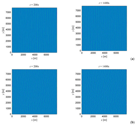 Characteristics of the simulated wave fields, such as the dominant wavenumber and the spectral width, do slowly evolve in the course of the simulation for 200 s < t < 1400 s. In general, the mean wavenumber and the mean frequency slightly grow, though their peak values decrease; the wave spectra for wavenumbers, frequencies, and angles become wider. The effect of increasing the wave directionality may be easily seen by the eye in Figure 1a, where the snapshots of the surfaces at t = 200 s and t = 1400 s are shown for the rough sea case with initially narrow angle spectrum. The evolution of spectrum is much less obvious for the situation of shorter-crested waves shown in Figure 1b. The surface displacement variance remains approximately constant during the simulations as the energy is conserved with very good accuracy. The relative error of conservation of the total energy in the period 200 s < t < 1400 s is less than 1 × 10–3.