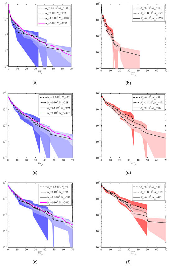 When the volume of the statistical ensemble grows with Nw, rarer and more extreme events occur, and correspondingly, the curves of P(T) generally continue to larger values of lifetimes T/Tp and to smaller probabilities (down to 1/Nev). Though the curves P(T) for different ensembles generally agree, noticeable discrepancies may be found not only in the tails of the distributions, but also at the levels of relatively frequent events (e.g., the solid curves in Figure 2d,f). The confidence intervals shrink with the growth of Nw, and are shown with colors in Figure 2, where lighter colors correspond to larger wave ensembles. The dependences plotted with the same line styles in the left and right sides of each row in Figure 2 correspond to approximately similar numbers of Nev. The overall ensemble in series A0 consists of about 6⋅104 wave lengths simulated for 120 wave periods, i.e., 7⋅106 wave-periods; the corresponding curves are plotted in Figure 2a,c,e with the magenta lines. The number of simulated realizations in the series E0 is about 10 times smaller than in the series A0, thus, the probability distribution for the series A0 is expected to be more reliable.