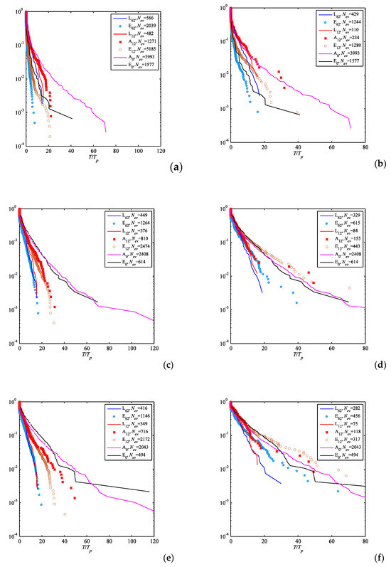The issue of a necessary amount of data that is sufficient to distinguish the difference between extreme (and rare) event probabilities at different conditions is not obvious. In Figure 2a–f, we plot the distributions for different volumes of statistical ensembles to check the convergence of the probabilistic description. The numbers Nw in the legend denote the approximate numbers of waves in the sequences, which were simulated for the period of about 120Tp and which compose the statistical ensembles. This approach of indirect verification of the probabilistic description does not always serve well, as we emphasized in [21], where very rare events were shown to be able to influence the probability distribution for relatively frequent events.