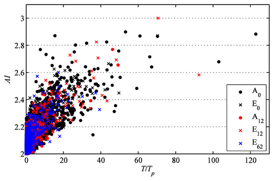 The relation between the rogue event lifetimes and the amplification factor AI (1) is shown in Figure 4 for the choice m = 2.5. The scatters for different series exhibit very similar appearances (the linear simulation data are not used), therefore they are plotted in Figure 4 altogether. It follows from the figure that longer-living events are generally characterized by larger amplifications, though a tendency to saturation of AI may be noticed. The maximum wave amplification attained in the performed simulations is about 3. The events in the interval AI = 2.8÷3 are from the most representative series A0, and also from E0 and E12; the corresponding rogue events possess the duration from 15 to 120 wave periods.