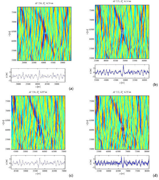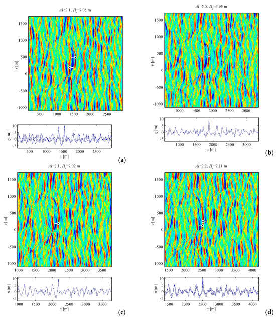 The events shown in Figure 5 and Figure 6 correspond to waves with small directionality (the series E12); they last for about 40 wave periods and travel during these time spans for more than 3 km, while the condition (1) is not satisfied continuously during the concerned periods. When AI significantly exceeds the value of two, rogue waves are found in more than one longitudinal cuts (e.g., Figure 5b,d), hence the lateral size of the rogue wave generally grows with AI. The rogue event in Figure 5 is a part of a long-living slant wave pattern; the characteristic length of the wave front is of the order of 1 km. Generation of rogue waves in slant groups was pointed out in [29]. A more complicated pattern that contains rogue waves is displayed in Figure 6 (see in particular Figure 6a), where essentially directional wave dynamics may be clearly seen. Then, the lateral wave structure may be complicated (see Figure 6b). Rogue waves with different shapes can occur: With large single crests (Figure 5a,b) and sign-changing waves (Figure 5c, Figure 6c). Depending on the location, the shapes of rogue waves in Figure 5d and Figure 6a,b vary drastically. The deeper trough may be at the front or rear slope of the wave; ‘holes in the sea’ may appear as well.