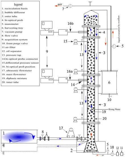 Bubble columns are industrial (process) devices that provide a mixture of a bubbly gas phase and a liquid phase. For some decades, studies carried out on this device contributed to the understanding of their hydrodynamics [1]. An air-lift column is a bubble column in which a partition has been introduced to channel the flow of the liquid and gaseous phases between several compartments of the column. The injection of air made into one of the compartments makes it possible to modify the apparent density and expansion of the two-phase fluid, causing the circulation of the initially immobile liquid phase [2]. Air-lift columns have been the subject of several studies in the mining and oil industry [3]; in aquaculture [2] as well as in chemical and biochemical processes [3]. The air-lift vacuum column that is the subject of this study is based on the principle of air-lift and flotation, under vacuum. The technology has been patented by the French Research Institute for the Exploitation of the Sea (IFREMER) and the National Institute of Applied Science (INSA) Lyon [4]. The column combines in its operation the functions of hydraulic pumping, solute transfer and particulate phase separation and minimizing energy costs [2]. The gas–liquid flows in these columns are intrinsically unstable and the dynamics of such flows influence the mixing and mass transfer performance of the bubble columns. It is therefore important to characterize the dynamics of the gas–liquid flow [5]. Moreover, the complete knowledge of the overall dynamics of the fluids in the bubble column rests on that of the bubbles [6]. Knowledge of bubble size distribution and gas holdup is crucial for determining interfacial gas–liquid mass transfer [7]. The analysis of the particle size of the bubbles in the columns can be is either performed by intrusive techniques, disturbing the flow or by non-intrusive techniques. Non-intrusive techniques use either tomographic probes [8,9], or image analysis by particle image velocimetry (PIV) [3,10,11,12], intrusive techniques rely on the usage of probes like fiber-optic probes, etc. [3]. In terms of results, intrusive techniques provide local measurements, while non-intrusive techniques provide a cross-sectional distribution with different spatial and temporal resolutions [6]. The advantages and disadvantages of different intrusive and non-intrusive techniques and their applications to multiphasic flows have been presented by several previous works [13]. Optical probes are phase detection devices that have been developed for several decades [14,15,16,17,18]. The optical probe uses the variation of the refractive index of the medium which characterizes the phase change. This is a principle that has been used for a long time for level detection and has resulted in several achievements. Optical probes are intrusive devices used very widely because of their great ease of use and the quality of the measurements obtained [19,20,21,22,23,24,25]. They have several advantages including a very fast response (less than s for a single fiber probe), a very good spatial resolution (less than m for a single fiber probe) and their use in a wide range of pressure and temperature [26]. Among the authors who have carried out work with the optical probe, Cartellier [14] has characterized the performance of single-fiber optical probes for measuring gas holdup. Serdula and Loewen [27] conducted a series of experiments to evaluate the feasibility of using a single-fiber optical probe to measure the gas holdup. They found that these probes could be used to perform measurements of gas holdup, bubble size and velocity. Kiambi et al. [28] evaluated the accuracy of an optical bi-probe technique to perform two-phase local flow measurements for 2.15 and 4.5 mm size bubbles. Comparing this technique with imaging, they concluded that optical probes underestimate the gas holdup from about to . They also reported errors of less than for gas velocity up to 38 cm·s. Rojas and Loewen [20] demonstrated that single-fiber optical probes are capable of accurate and simultaneous measurements of gas holdup and bubble sizes under breaking waves. Vejrazka et al. [29] studied the mechanisms contributing to errors in optical probe measurements. Measurement errors have been reported based on a modified Webber number (M), which is the holdup of the bubble moment to the pulse of the surface tension of the probe, and characterizes the ability of the bubble to overcome the surface tension. It is reported that, in the case of M greater than 50, the gas holdup and the maximum chord measurement error should be less than . Mizushima and Saito [30] developed a 35° angle single-fiber optical probe that generated a pre-signal when the bubble is pierced in the center, allowing differentiation between bubble detection and diameter measurement. Pjontek et al. [22] used a single-fiber optical probe to measure local bubble characteristics in a 101.6 mm diameter column operating at pressures up to 9 MPa. Aliyu et al. [25] have developed a dual optical fiber probe system for measuring the hydrodynamic characteristics of a gas–liquid flow. The gas velocity and bubble size values measured by the fiber optic probe are in line with those estimated using a photographic method using a fast camera system. In addition, the vacuum levels obtained with fiber optic probes showed good agreement with the holdup of air drawn in the two-phase mixture as measured by a flow meter. Fiber optic probes have the advantage of high sensitivity and minimal intrusion due to their micrometric size, and can be used when other instruments are difficult to deploy or do not give the temporal resolutions. The study presented in this paper consists of the determination of the phase indicator functions of two-phase flows in a vacuum air-lift column. These functions are the gas holdup, the superficial gas velocity and the particle size of the bubbles, the flow rate and the velocity o