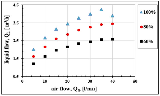 Since the liquid flow is a function of the air-lift airflow, we installed a shut-off valve on each duct connecting the column to the recirculation basin. These valves allow us to modify the liquid flow rate for a fixed air flow. In Figure 6 below, the liquid flowrate evolution at the three regimes are shown. At the first rate curve corresponding to a total opening of the valve () of liquid flow, two others are added, corresponding to 80 and of the initial flow. The two new curves illustrate that, whatever the liquid flow rate, the pumping regime keeps the same profile with a maximum reached for an air flow of 30 L·mn.