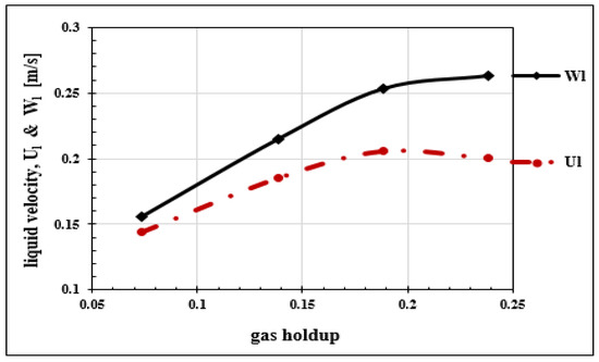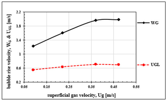The profile of bubble rise velocity as a function of the superficial gas velocity (Figure 9) shows that the bubble rise velocity reaches a plateau starting from a superficial gas velocity m·S. The plot of the real liquid velocity as a function of the superficial gas velocity (Figure 10) also shows the same threshold effect for the same value of ( m·S).