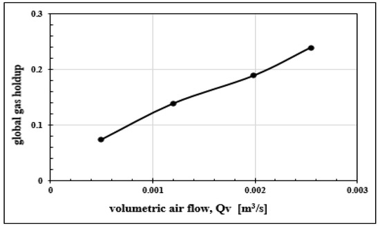 The gas holdup increases with the air flow () while the variation of the pressure () is inversely proportional to the same air flow. In Figure 12, the global gas holdup is represented in relation with volumetric air flow (); as expected, the overall gas holdup increases with the injected air flow rate and will be compared hereafter to the local gas holdup measured by the optical bi-probe as in Besagni et al. [36]. This accuracy will also depend on the difference that will be obtained between the values of the two gas holdup measurements.