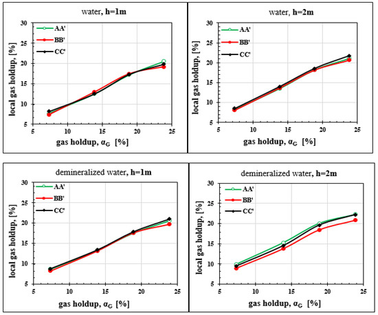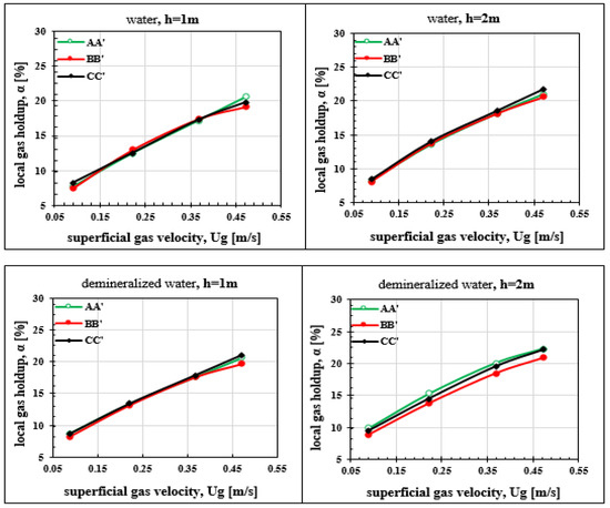 Local gas holdup is deduced from one of the two channels of the optical probe. Only one tip of the probe can be used to measure time during which it is exposed to gas and time for liquid. This measurement is made in two different sections of the column one meter apart. Measurements are carried out, first, in the presence of tap water, subsequently with demineralised water to analyze the effect of the hardness of the water on the gas holdup. The results of the various measurements illustrated in Figure 13 and Figure 14 point out that, in the configuration of our study, the hardness of water has pratically no effect on the gas holdup. The results for both types of water are very close for the first section. With demineralised water, there is a slightly higher gas holdup at 2 m. The difference is small, BB’ results are for example practically identical for both tests (nature of water). With demineralised water, a slight dissymmetry appears with a slightly higher gas holdup in AA’ and CC’. This increase in the gas holdup is explained by the phenomenon of bubble coalescence, which is more important in demineralised water. The increase of gas holdup with height has already been reported by Besagni et al. [36]. The coalescence of the bubbles seems to have as much impact on the detection time of the bubble by the probe tip as on the bubble size; this would explain the slight increase in gas retention with height. In addition, Wilkinson et al. [37] reported that, when (height over diameter), the effect of the column height becomes negligible, which is the case of the geometric configuration of the column studied here.