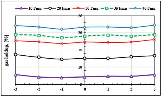 Optical bi-probe measurements are also made along six radial axes, in order to see the transversal profile of the gas holdups. Figure 15 does not show any disparity of the gas holdup values according to the different measurement axes. The radial distribution is practically homogeneous for the same air flow. By varying the air flow, it naturally results in an increase in the gas holdup with the injected air flow. This phenomenon is illustrated in Figure 16 below.