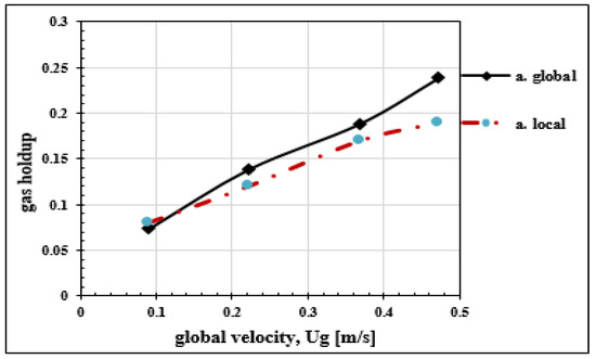 Relationship between global and local gas holdup with superficial gas velocity.