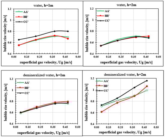 The bubble rise velocities measured with the optical bi-probe are averages made on a sample of bubbles. These measurements are made in ordinary water and demineralized water to evaluate the effect of water quality on the rate of rise of air bubbles. For each of these types of water, the measurements are also made on the two vertical measurement positions: 1 m and 2 m from the column base. The results of the bubble rise velocity measurements are presented as a function of according to the superficial gas velocity on Figure 18. For each measurement configuration, five air flows are tested: 10 L·min; 20 L·min; 30 L·min; 35 L·min and 40 L·min. In order to observe the transverse gas velocity profile, measurements on the radial plane and along three diameters (AA’, BB’ and CC’) are also presented in the same figures. For all cases of velocity measurement, the radial gas velocity profile is homogeneous and the values obtained for the three diameters are very close. The bubble rise velocity increases until airflow of 35 L·min. Beyond this rate (35 L·min), a threshold effect is set up and the velocity no longer increases. As explained for , this is due to the appearance of the counter air-lift causing a slowing of the flow velocity of the two-phase mixture. The effect of counter air-lift appears as soon as one reaches a superficial gas velocity of rise m·s (Figure 9).
