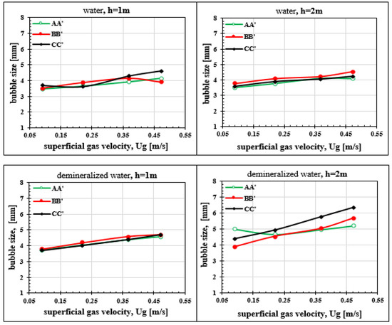 Average bubble diameter is determined using the optical bi-probe. The results show that the bubble size distribution is uniform on the horizontal plane. The diameter of the bubbles increases linearly with the superficial gas velocity and, for all measurement axes, the profile remains practically the same even with a mean diameter of 4.17 mm (Figure 20). In ordinary water, the height position of the measuring point by the optical bi-probe does not seem to have a significant effect on the bubble size. On the other hand, in demineralised water, diameters are larger than in ordinary water. The diameters measured at 2 m height in demineralized water are larger than those obtained at 1 m. This difference in bubble size is explained by the fact that, in demineralized water, the coalescence of the bubbles is more significant during their rise. Measurements made in demineralized water at 2 m height indicate a great irregularity of the horizontal profile of the mean diameters of the bubbles.
