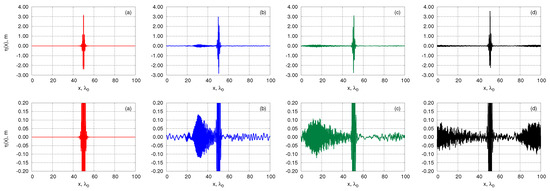 For experiment 3 with the maximum value of amplitude amplification exceeds by ≈. The evolution of the surface elevation profile, corresponding to this case of phase synchronization, is shown in Figure 6, while Figure 7 demonstrates the same experiment but in the case of minimum amplification (i.e., phase desynchronization).