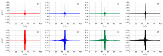 Propagation of single breather with the wave steepness in the fully nonlinear model. The initial condition in physical variables was restored with the second order accuracy from variables of the Zakharov equation. (Top) row: the surface elevation at different subsequent moments of time. Panel (a) shows the initial surface profile (at ); panel (b) corresponds to ; panel (c) corresponds to ; and panel (d) corresponds to (Bottom) row: zoom of the top row pictures.