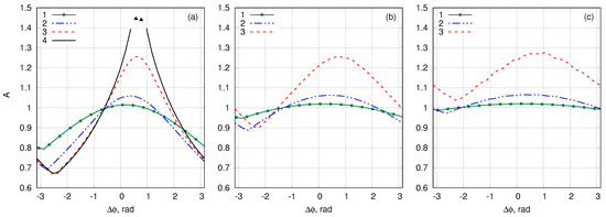 The maximum amplification A of the wave field amplitude of colliding breathers depending on the relative phase for the all four numerical experiments performed in this work. The green solid curves 1 with dots corresponds to experiment 1, the blue dash-dotted curves 2 with dots—experiment 2, the red dashed curves 3 with dots—experiment 3, the black solid curve 4—experiment 4. The black triangles mark the wave breaking. Panels (a–c) correspond to the three different values of the relative velocities of the breathers in ascending order. The values of all parameters are listed in the Table 1.