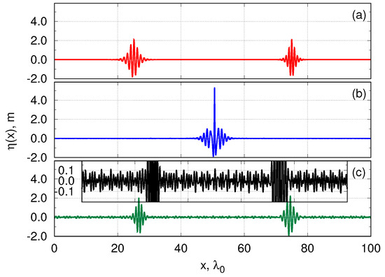 Collision of breathers studied in experiment 3 with the relative velocity and the phase difference . Snapshots show the surface elevation function at the initial moment of simulation (snapshot (a)); at the moment of maximum amplitude amplification (snapshot (b)) and at the final moment of simulation (snapshot (c)). Zoom of the final amplitude profile is shown in the inset of the snapshot (c).