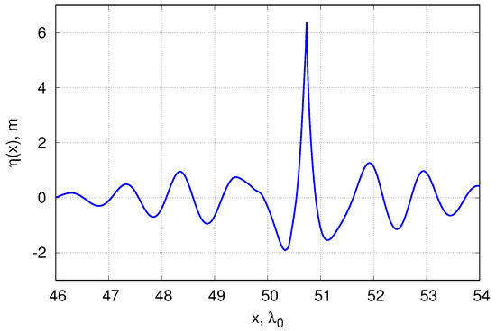 The further increase of the breather amplitudes leads to appearance of wave breaking during their collisions—see the amplitude amplification function corresponding to experiment 4 in Figure 5. The wave breaking first appears for the breathers with synchronised phases at the moment of interaction, when wave steepness reaches very high value. In Figure 8 we show the wave profile of the colliding breathers right before the wave breaking. Note, that in this work we do not use any special procedure (like adding a dissipation to numerical scheme) to avoid or mitigate wave breaking. This effect appears naturally as a result of high increase of wave steepness at certain moment of breather collision and we expect that similar situation can be observed in laboratory experiments. Once our numerical scheme detects wave breaking, it stops the simulation.