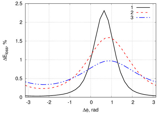 The total energy losses (in percent—see Formula (39)) of breathers after their collision depending on the relative phase . The picture corresponds to experiment 3 with the relative velocity .