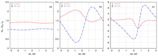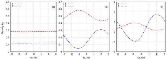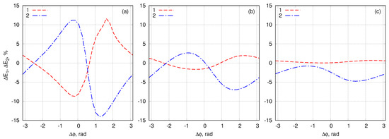 The individual energy change (in percent—see Formula (41)) of breathers after their collision depending on the relative phase in experiment 3. The dashed red curve 1 shows dependence of the energy change for the left breather while the blue dash-dotted curve 2 corresponds to dependence of the energy change for the right breather . Panels (a–c) correspond to the three different values of the relative velocities of the breathers in ascending order.