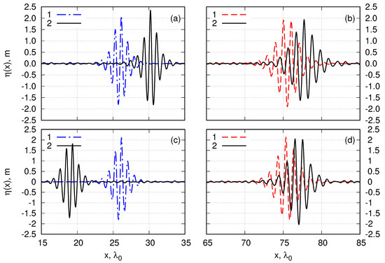 When an initial condition is restored only with the first order accuracy, the corresponding breather radiates incoherent waves of significant amplitude during initial stage of its propagation—see Figure 1. The radiation of incoherent waves changes shape of the breather and makes parameters of the final stable solitary wave group hardly controllable. In particular, it is difficult to generate stable breather with certain phase, what is important for our work. That is why here we suggest to use the high order accuracy transformations (21) and (22) when generating an initial condition.