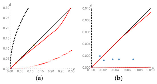 (a) The ϵ − δ space, mapping the hydrodynamics (red dots) [19,20,21] and optics (blue dots [26,27,28,31] experimental conditions of modulational instability (MI). The horizontal axis is the steepness representing the nonlinearity and the vertical axis is the spectral bandwidth representing dispersion. (b) Enlarged view highlighting the optics experiments. The solid black line corresponds to or Benjamin–Feir Index (. Black dashed line corresponds to and . The red dotted line corresponding to and is plotted for visual guidance. The red solid line indicates the maximum growth condition of the MI [40].