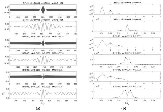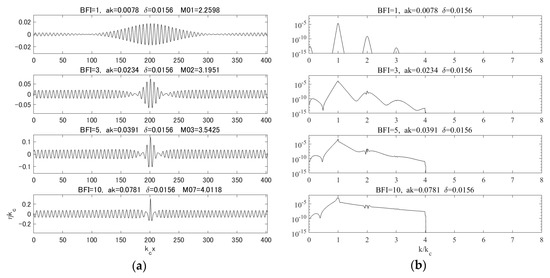 Therefore, the control parameters of the numerical experiments are, and . The test cases are summarized in Table 1. For Cases 1 to 4, the spectral bandwidth is one order of magnitude smaller than the typical water wave, or , and the selected cases of cases will be presented. For Cases 5 to 7, or , is two orders of magnitude smaller, and the will be presented. The number of model discretization is chosen such that each wave has 16 grid points. With the anti-aliasing filter [46], the effective spectral bandwidth is and therefore the model frequency domain is limited to the fourth harmonics of the carrier wave, i.e., 4 × .