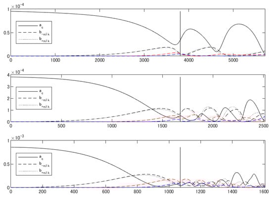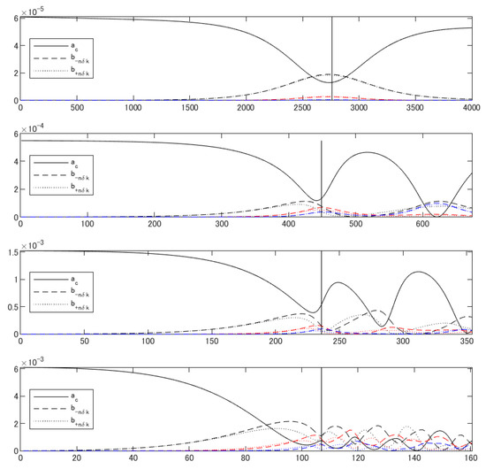 Evolutions of the spectral modes of cases are shown in Figure 5. The amplitudes of the carrier wave, and the sidebands at , where , are shown. The vertical line indicates when the crest height was the largest. Note that the growth rate increases with the initial steepness, and therefore, the timing of the maximum amplification shortens. The horizontal axis is adjusted accordingly in Figure 5. For the case, the maximum crest amplification occurs when the imposed sidebands at reaches the maxima (black dashed and dotted lines). Energy is transferred to the naturally growing second set of sidebands at as well (red dashed and dotted lines). For the higher s, the energy is transferred to even higher modes at (blue dashed and dotted lines), and their largest amplification coincides with the maximum crest height. At , the evolutions of the modes are rather chaotic, and the system does not recur.