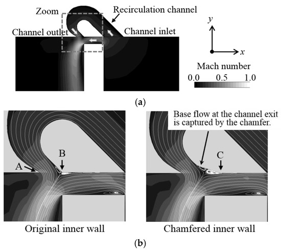 Figure 4b shows an attempt to improve the inner wall shape by two-dimensional numerical simulations. Figure 4b compares the two-dimensional streamlines and Mach number distributions in the gray dashed square inset of Figure 4a between the original inner wall shape and a chamfered inner wall. With the original inner wall shape, the recirculating flow separates at the RC outlet at the confluence of the leakage flow at Position B in Figure 4b. This interaction causes a blockage of the recirculating flow at the channel outlet, which undesirably weakens the effect of this casing treatment design. In the chamfered inner wall case, a larger flow separation occurs at the Position C in Figure 4b. Nevertheless, as the separation bubble is accommodated into the chamfer of the channel inner wall, the saddle point between the recirculating flow and the tip leakage flow shifts upward.