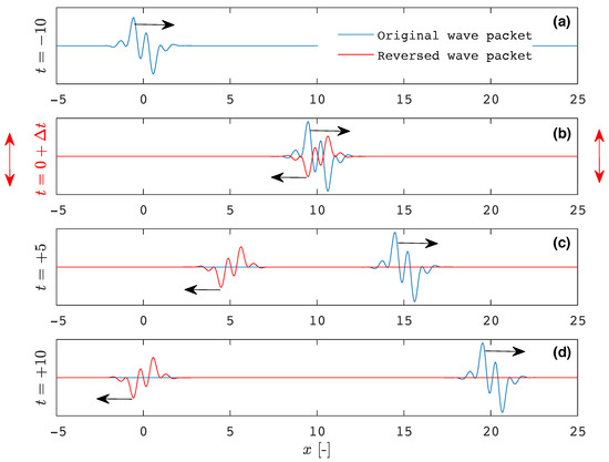 Figure 1. Time reversal of a gravity wave packet (blue) interacting with sudden vertical oscillation by an acoustic mode, n = 0 . Each subplot represents a different time snapshot. The original wave packet amplitude S + = e X 2 sin 3 X cos 5 X travels solely in (a); the triad interaction starts at time T = 0 for a duration of Δ T , which generates a gravity wave (red) with a similar wave packet (b) that travels in an opposite direction as illustrated in (c,d).