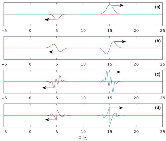 Figure 2. Comparison between the original disturbance (blue) and the time reversed wave packet (red) for different initial envelopes: (a) e X 2 ; (b) e X 2 sin X ; (c) e X 2 sin 3 X cos 5 X ; (d) 2 e X 2 5 X 1 2 + 5 X ; all with n = 0, κ = 0 .