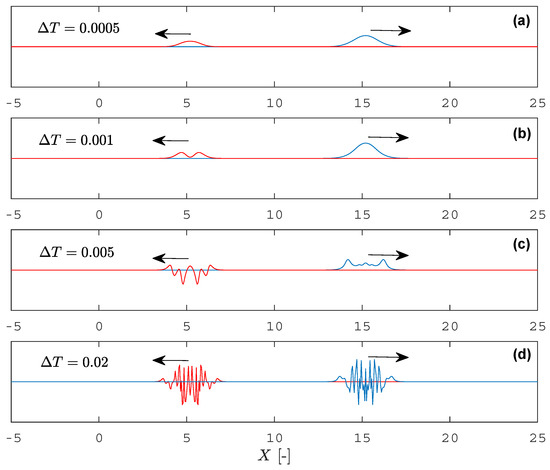 Figure 3. Comparison between the original disturbance (blue) and the time reversed wave packet (red) for different interaction times, (a) Δ T = 0.0005, (b) Δ T = 0.001, (c) Δ T = 0.005, (d) Δ T = 0.02, with n = 1 .