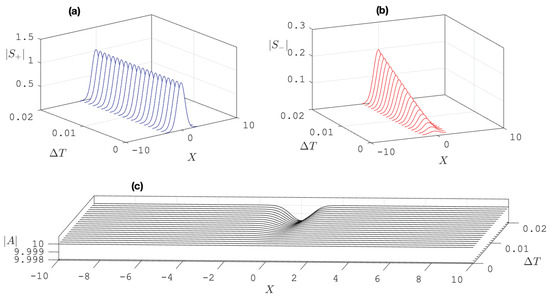 Figure 4. Amplitude evolution of the time reversal triad: (a) original disturbance; (b) time reversed disturbance; (c) acoustic mode; n = 0 ; A | T = 0 = 10 ; S + | T = 0 = exp ( X 2 ) ; S | T = 0 = 0 .