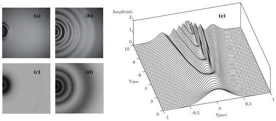Figure 5. (a,b): Photographs of the wave field generated by a falling steel ball on a vertically oscillating liquid bath, at times t = 51 ms (a) and t = 173 ms (b) after the collision—(a,b) are presented in [15]. (c,d): Simulations of the wave field generated from nonlinear triad resonance of two surface waves propagating in opposite directions, and a compression mode oscillating in the vertical direction, at times T = 17 (c) and T = 51 (d). (e): Evolution of the surface wave amplitude during the resonant interaction.