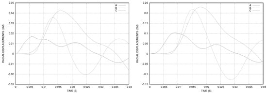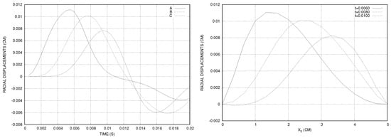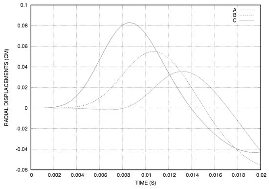 For Mesh 1, the time step was set to s, the number of time steps to and . The total CPU time was 323 s (8.07 s/iteration), on a computer with a processor of 4 × 3.30 GHz frequency and 16 Go RAM. The radial displacement of the interface was measured at three points: , , and (see Figure 9). We observed that the maximal displacement of point A was more than 0.08 cm, which was more important than in the case of straight cylinder (see Figure 3). The artery deformation was more important in the uphill zone of the stenosis than in the case of healthy artery.