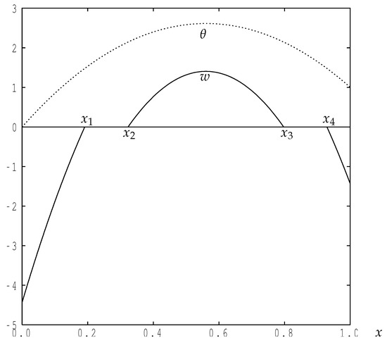 Later we shall see that the present system admits situations where either the whole channel is stagnant, or else that there exists either one or two stagnant regions bounded by flowing regions. An alternative viewpoint is that, when flow exists, then there may be two, three or four yield surfaces. One example of a situation in which there are four yield surfaces and two stagnant regions is shown in Figure 1 and this corresponds to the case, , and . The temperature profile has no symmetry and the locations of the four yield surfaces are denoted by the values, , , and . These values satisfy the following equations,