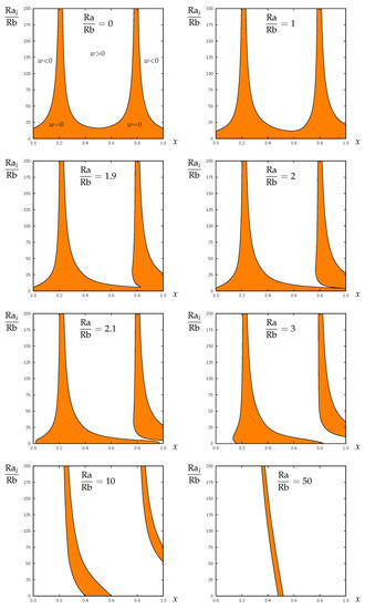 When the heating is purely internal then it is not possible to find an analytical expression for or for the locations of the yield surfaces even though the symmetry of the system means that . Therefore we have resorted to purely numerical means to determine where the yield surfaces are as a function of , and these are shown in Figure 2c. However, it is possible to find where the yield surfaces arise when begins to increase from zero. Given that , Equations (13) and (14) with and give ) = 0.211325 while it is clear that x3 = x4 = (1 + ) = 0.788675; both these values may be seen in Figure 2c. It is also possible to determine the value of Rb above which the channel becomes fully stagnant. This is achieved by setting x1 = 0, x2 = x3 = and x4 = 1 into Equations (13)–(16), and then we find that stagnation corresponds to Rb > Rai.
