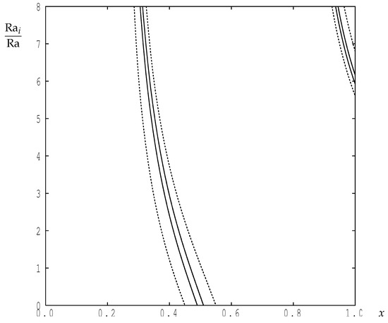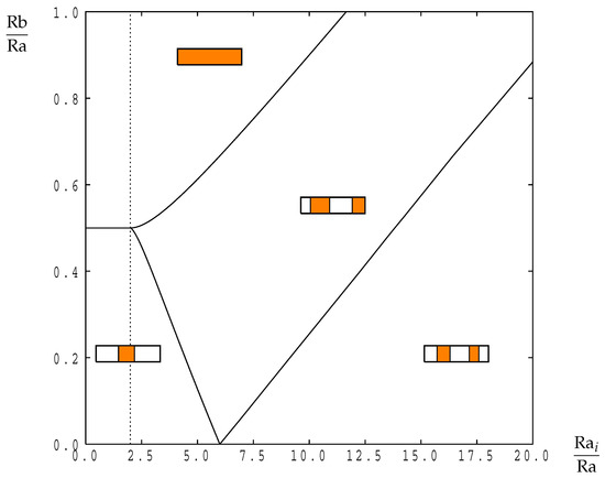 The dotted line separates the regions where the temperature field has an internal maximum () and where it has a maximum at (). The boundary of the fully stagnant region has already been shown to be given by Equation (24) when to the right of the dotted line and by Equation (25) when to the left—expressed in terms of the ratios given in Equation (26) these are