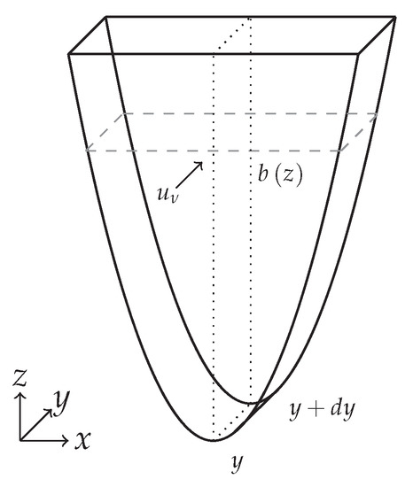 We derive a flow model for a viscous fluid in a parabolic fissure. Consider a fluid element formed by vertically cutting through a parabolic prism, as seen in Figure 1. Conservation of mass dictates that the rate of change of fluid in the elementary volume is equal to the difference in volumetric fluxes through the faces at y and :