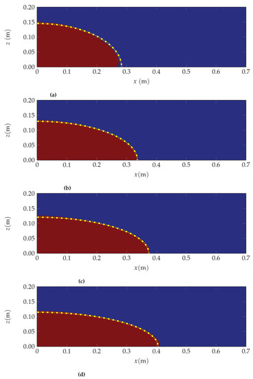 Comparisons in the plane cross section between the NSE simulation and 1D flow model at (a) 1.3 s, (b) 2.3 s, (c) 3.3 s, and (d) 4.3 s. Red represents glycerol in the simulation results, the yellow dotted line is the free surface from the 1D model.