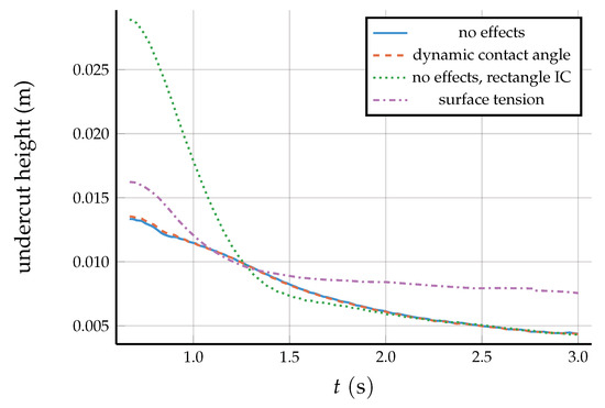 Height of undercutting plotted from its maximum as a function of time. The removal of surface tension results in a profile with less undercutting.
