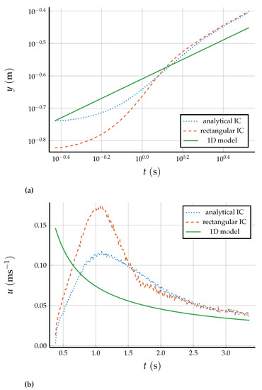 Simulations produced for different viscosities show that a period of velocity deficit and overcompensation occurs whenever a simulation is started, as compared to the 1D model solution. This presents a particular problem for experiments where it would be difficult to provide the initial condition with a velocity field from the 1D solution. The starting point of the initial condition relative to the similarity solution and lack of initial velocity are dominant factors in the lack of agreement between the two models. The simulations show increasingly poor convergence to the 1D model the later they are started in time, see Figure 6. In the case of our specific similarity solution, this corresponds to using a higher value of viscosity; a technique often employed to maintain laminar flow in experiments. Initial profiles close to the singular initial condition for the 1D model, and correct initial velocity, are far from the aspect ratio condition that makes the similarity solution applicable. Our results do not establish a general guideline for how severe this effect is; we have not generated a set of different initial profiles corresponding to the same initial moment in time for the different values of viscosity considered here. Still, Figure 6 does show that it would be easy to unknowingly choose a poor combination of initial condition and viscosity (or other parameters that make up a) prior to performing an experiment. Special attention should be paid to this issue.