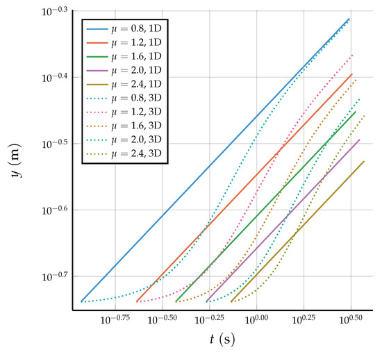 The previously presented results raise the question of whether or not early time inaccuracies of the 1D model can be predicted knowing only the parameters in Equation (9). Given that the coefficients of the right hand side of Equation (9) can be consolidated in a single constant a (Equation (13)), a single parameter can be varied without changing the ode problem given by Equation (14). A natural choice is to vary . This allows for all simulations to be performed with the same computational settings, preventing any false comparison of finite volume mesh-induced errors. For the same initial condition, simulations were conducted at the viscosities μ = 0.8 Pa·s, 1.2 Pa·s, 1.6 Pa·s, 2.0 Pa·s, and 2.4 Pa·s. This approach assumes that the parameter values result in a laminar flow, and that at the boundary the fixed parameters of Equation (10) guarantee the liquid phase free surfaces change strictly due to gravity. For each simulation, Equation (33) was used to calculate the simulation start time for the single numerical initial condition chosen in Section 2.3, since the same initial profile for different values of corresponds to different initial moments in time. Propagation distances are shown in Figure 6, while undercut heights are presented in Figure 7.