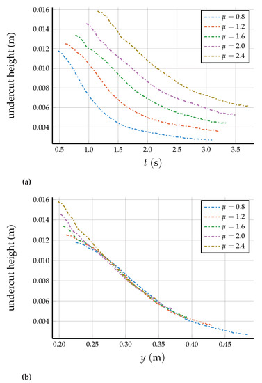 (a) Undercut heights plotted from peak value as a function of time. Shifting of the peaks is largely due to the start times calculated by Equation (33). (b) Undercut heights plotted from peak value as a function of space. In all cases, only is varied and no interfacial effects are present.